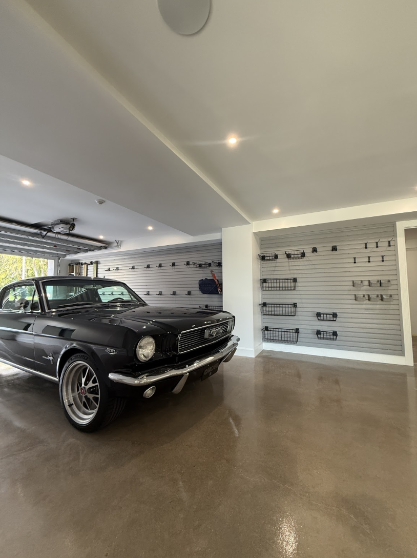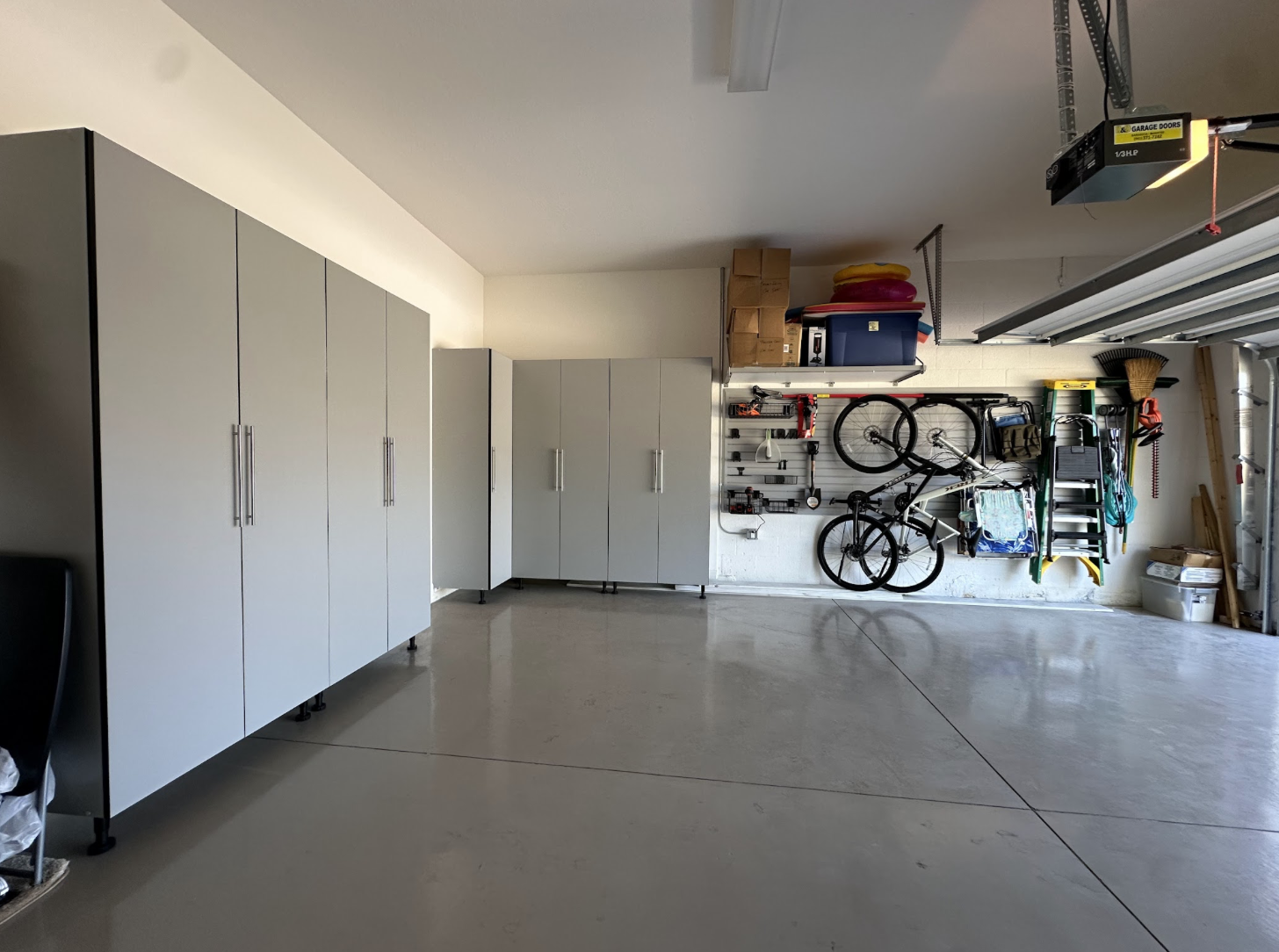 See this garage storage project in Nokomis, FL featuring an Auxx Lift powered overhead rack, Monkey Bars stationary overhead storage, fog gray cabinets, and slatwall.