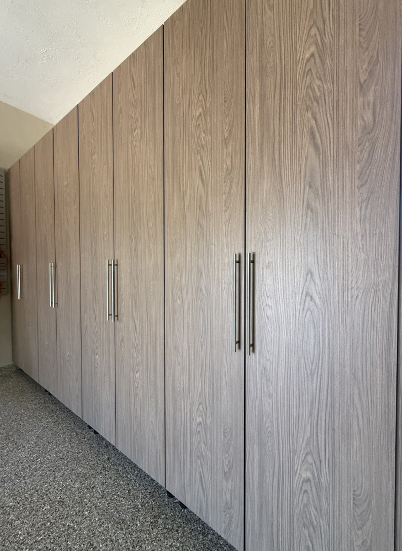See this garage storage installation in Bradenton, FL featuring fog gray cabinets and gray slatwall panels designed to keep tools and belongings organized.