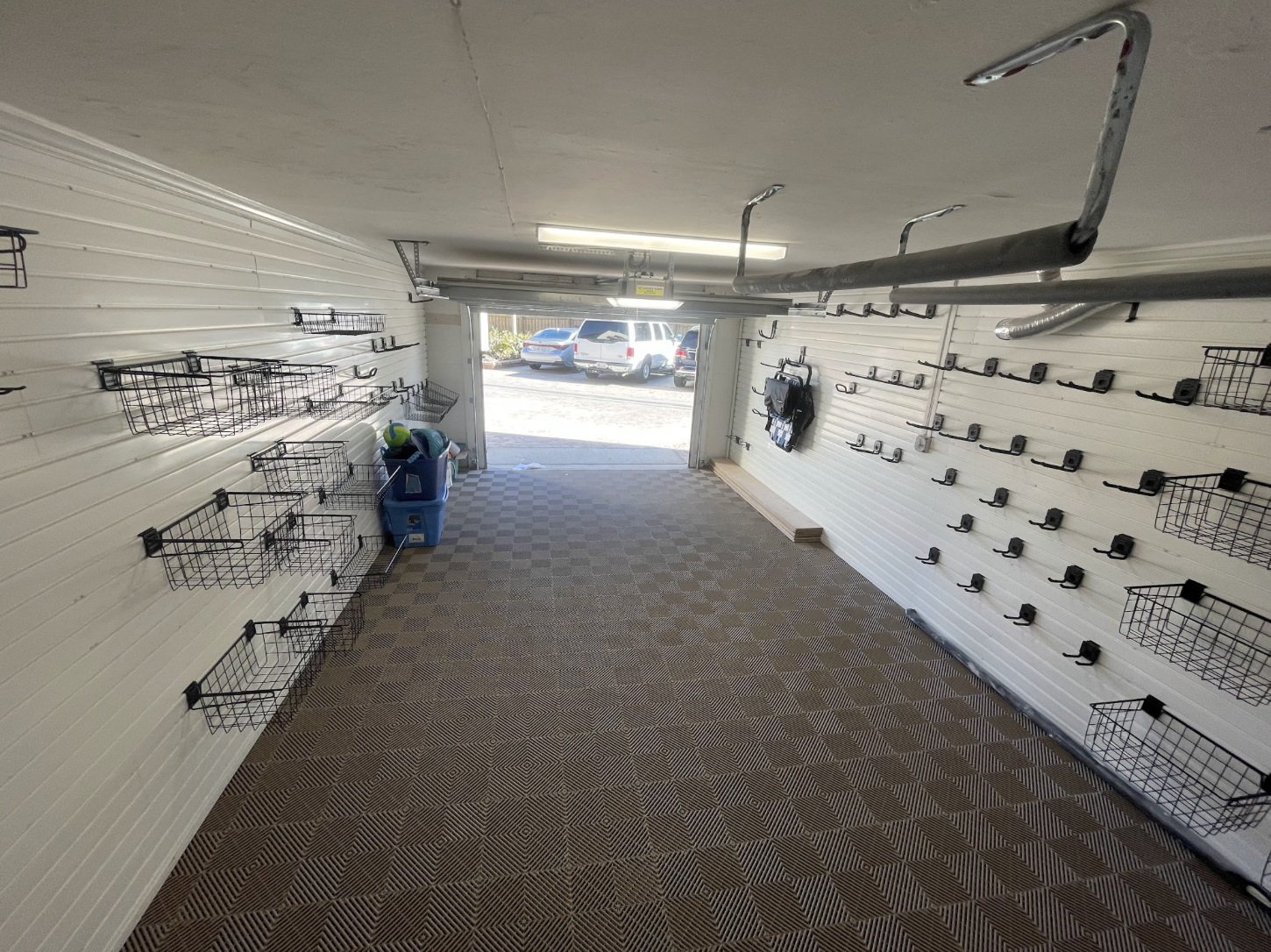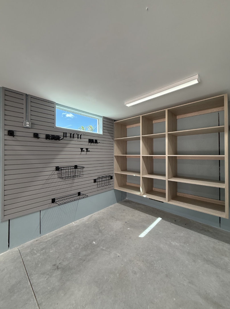 See this garage storage installation in Anna Maria Island, FL featuring custom White Tossini Elm cabinets and slatwall for organized wall storage.