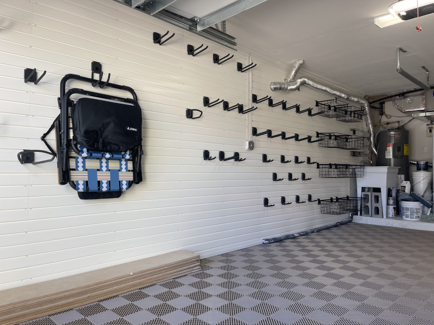 This garage upgrade in Siesta Key, FL focused on creating a clean and highly organized storage space while improving the durability of the garage floor. The homeowner wanted to wrap the garage in slatwall to maximize wall storage and create a flexible system for organizing tools, beach gear, and everyday items.