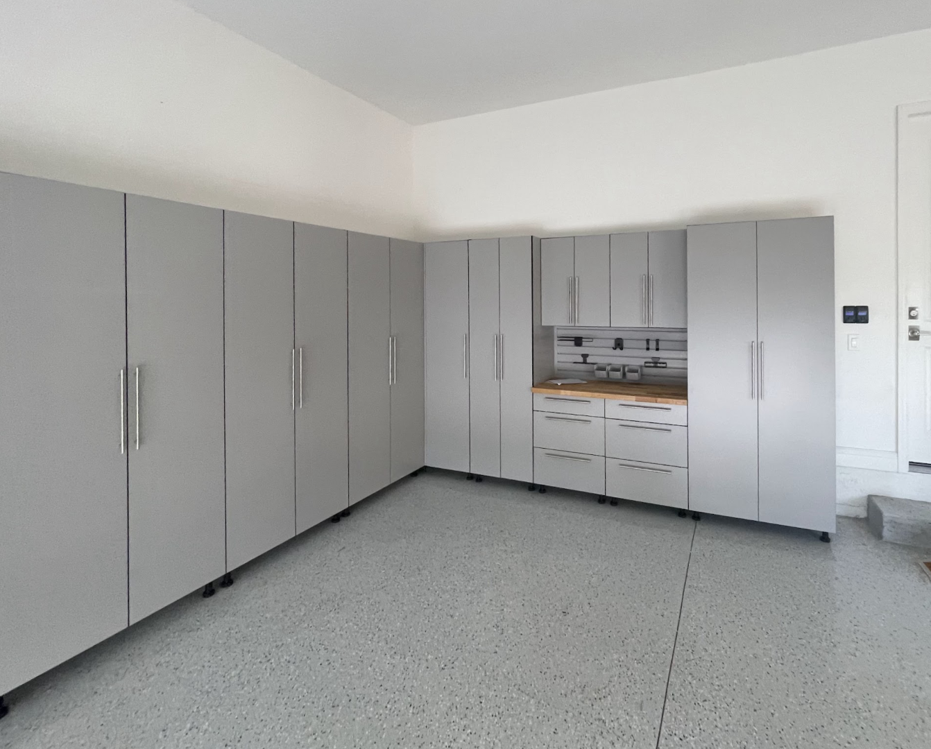 To make the space even more functional, the setup includes a 4-foot workstation with a butcherblock countertop, giving the homeowner a durable and attractive work surface. A slatwall backsplash was also added behind the workstation, creating convenient vertical storage for frequently used tools and accessories. The result is a garage that’s both highly organized and ready for everyday projects in Bradenton.