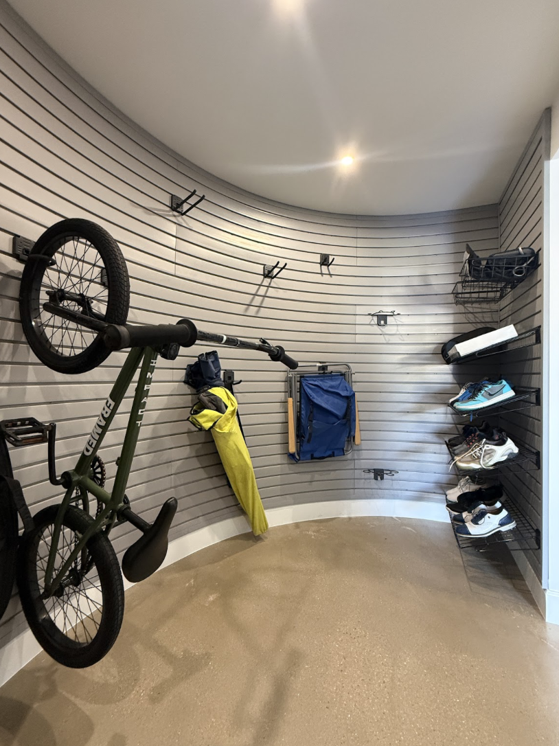 The solution was installing slatwall across the curved wall, creating flexible storage that can adapt to different needs over time. With slatwall hooks and accessories, the homeowner now has a versatile system for organizing tools, gear, and everyday items while keeping the floor clear. The finished setup turns an unusual architectural feature into a functional and organized storage area within this Sarasota garage.