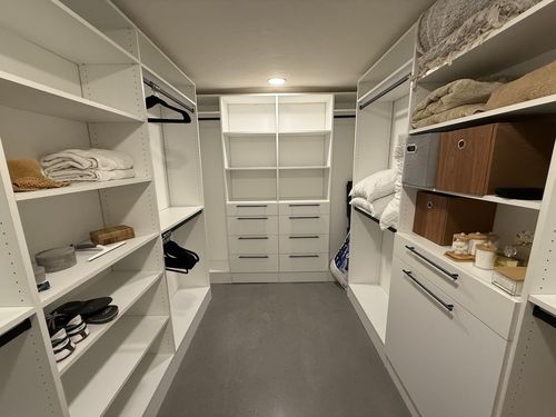 After hurricane damage left her without functional storage, Dawn in Siesta Key FL needed a closet solution that was both durable and stylish. We rebuilt her space with custom closet components tailored to fit her needs—and upgraded the look with bold black closet rods and matching handles.
