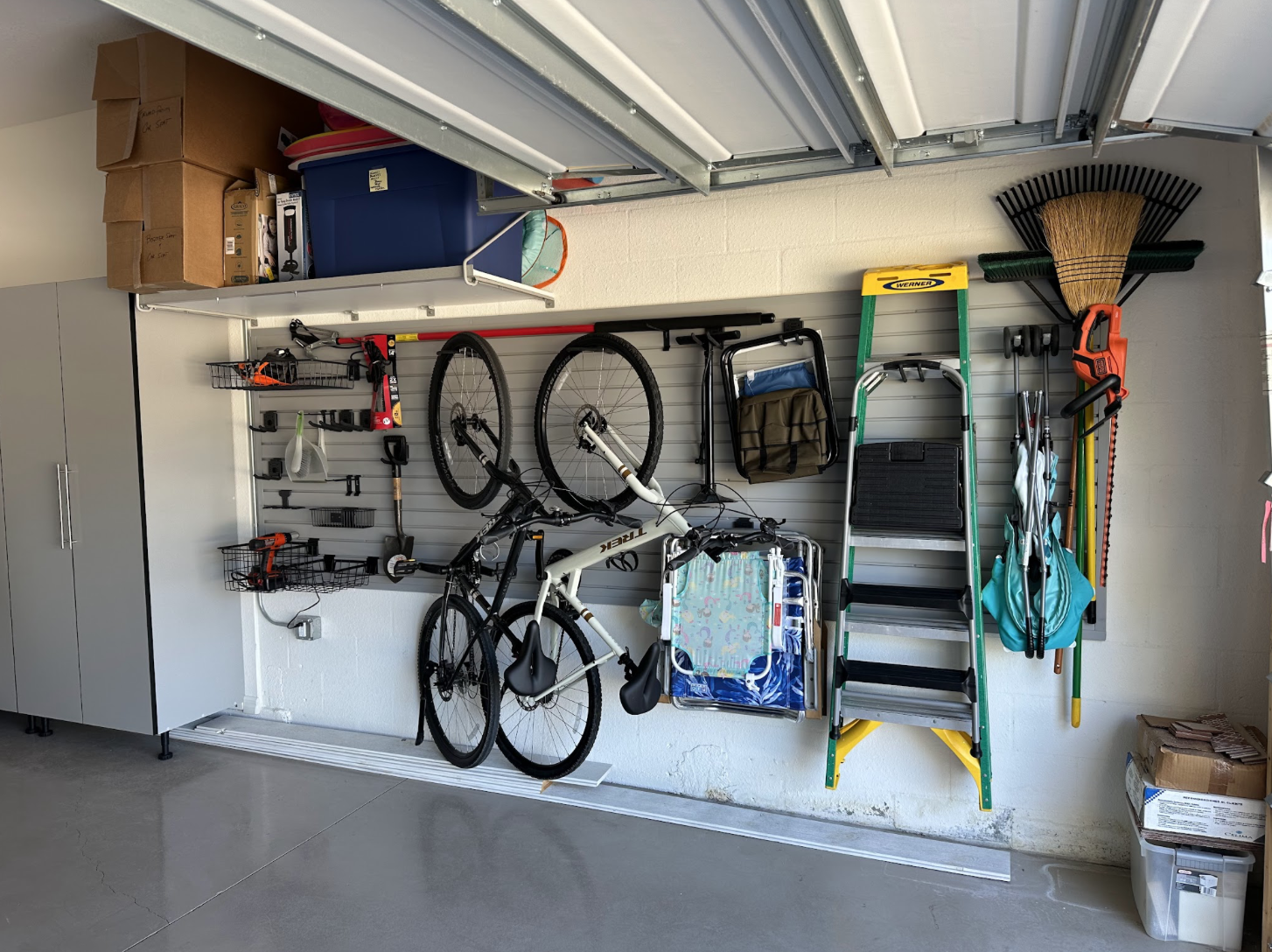 The solution included installing fog gray garage cabinets to provide enclosed storage for tools, supplies, and household items. To add even more flexibility, gray slatwall panels were installed along the wall, allowing the homeowner to hang tools, accessories, and frequently used gear. Together, the cabinets and slatwall create a practical storage system that lifts items off the floor and keeps the garage neat and organized for everyday use in this Bradenton home.