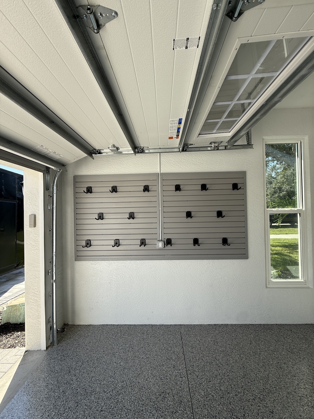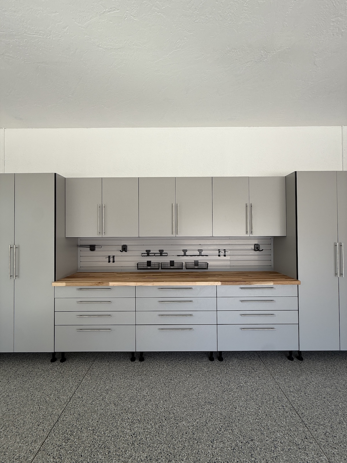 To complete the space, our team installed Fog Gray cabinets with black edge banding and 16” brushed nickel bar handles for a sleek, modern touch. The heavy-duty gray slatwall along both side walls boosts storage versatility without encroaching on valuable floor space. This elegant, efficient setup was completed in just one day by Gabe, Barron, and Lawson—proof that a clean, customized garage can be achieved faster than you think!