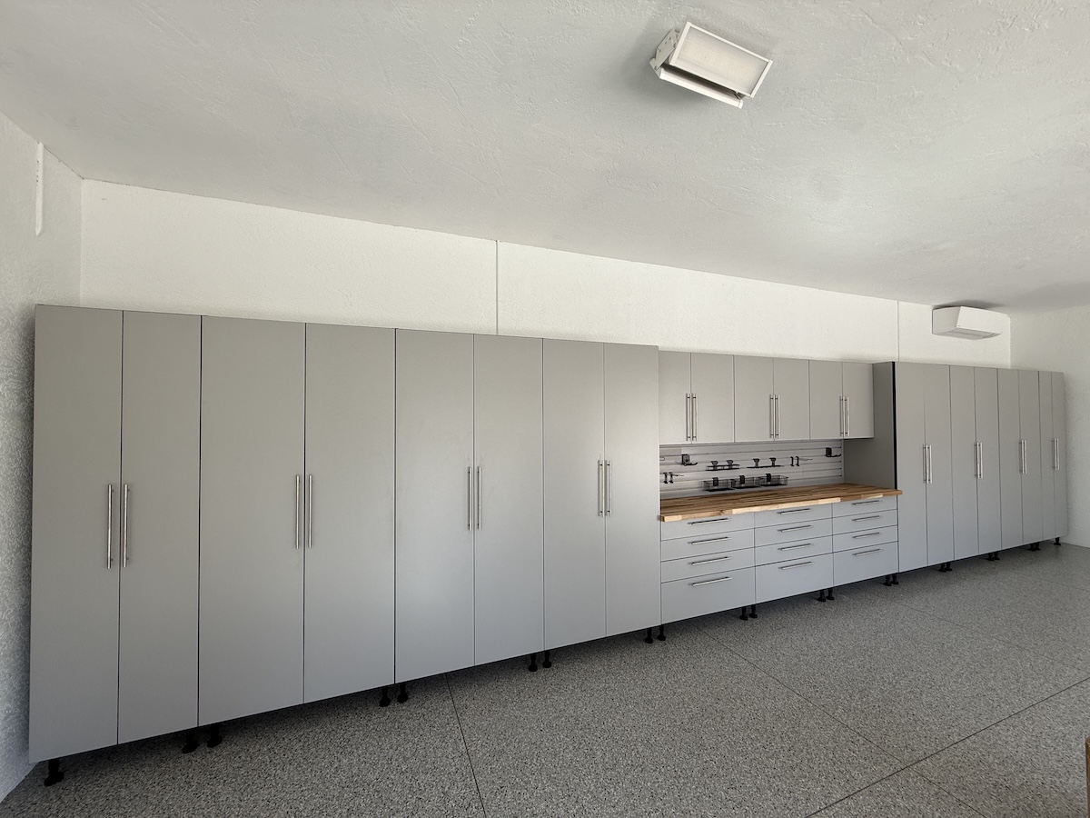 Richard’s garage in Sarasota, FL got the luxury treatment with a stunning 31½-foot run of custom cabinetry designed for both function and beauty. His goal was a symmetrical layout that would impress anyone peeking in from the driveway—and it absolutely delivers. Tall pantry cabinets frame each end, while a 9-foot maple butcher block countertop creates a warm, inviting workstation in the center.