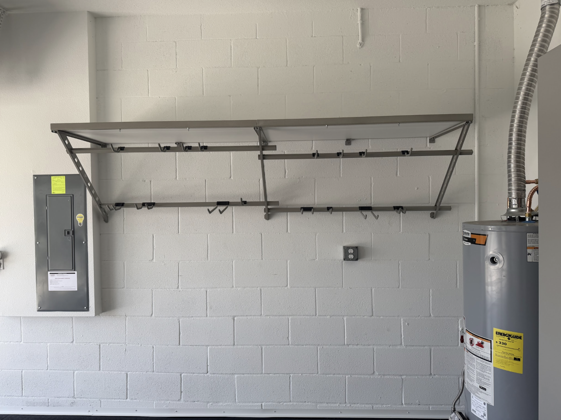 We installed a Graphite RaceDeck floor to create a durable, eye-catching foundation, complemented by a 10-foot bookend workstation along the back wall using StorPro fog gray cabinets with black edge banding and a 1 1/2" thick American Birch butcher block countertop. To maximize storage without impacting walking space, we added HandiWall slatwall with a smart LED lighting solution, a 24" x 8' Monkey Bars shelf rack along the left wall, 24" x 64" inverted shelving on the right, and a 4' x 8' overhead rack above the roll-up door for long-term storage. The result is a clean, organized garage that supports both everyday use and long-term storage needs—expertly completed in just one day by Jesse, Lawson, Barron, and Nolan.