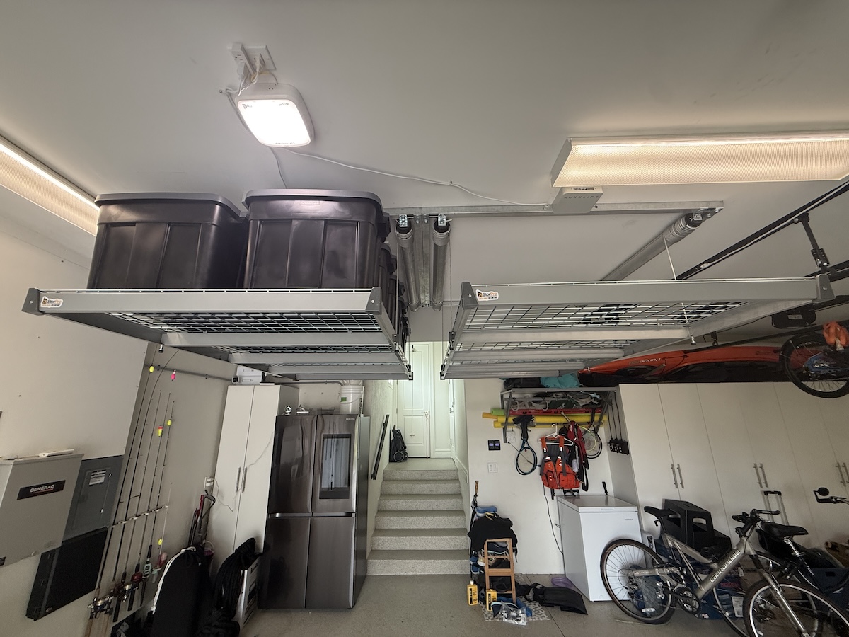 For this project, we installed a pair of Auxx Lift motorized overhead racks in a sleek Gray finish. Each lift measures 4' x 8' and offers an impressive 600 lb carry capacity, turning the unused overhead space into powerful, dependable storage. Seasonal items, bulky bins, and heavier gear can now be raised safely out of the way while still staying incredibly easy to reach whenever Paul needs them. The installation was completed by Gabe, Barron, and Ben, who made sure the system was dialed in, aligned, and ready for years of smooth operation in this Siesta Key, FL garage.