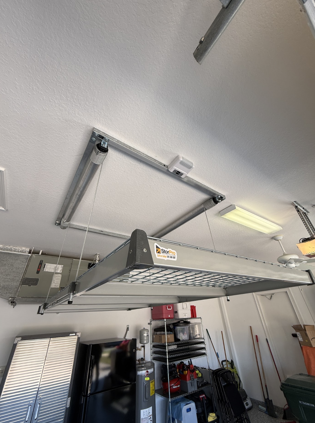 We installed a 4' x 8' Auxx Lift system with a 600 lb capacity, providing 32 square feet of motorized storage that can be raised or lowered with the push of a button. This setup allows the client to store items overhead while still being able to access them effortlessly. Due to the garage’s structure, we also incorporated an adapter kit to ensure proper installation since the lift direction didn’t run parallel with the trusses. Installed in just a few hours by Gabe and Barron, this upgrade delivers both convenience and performance in one clean solution.