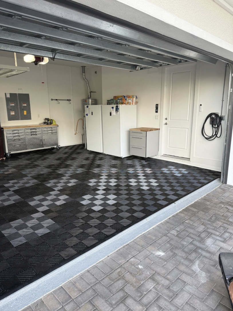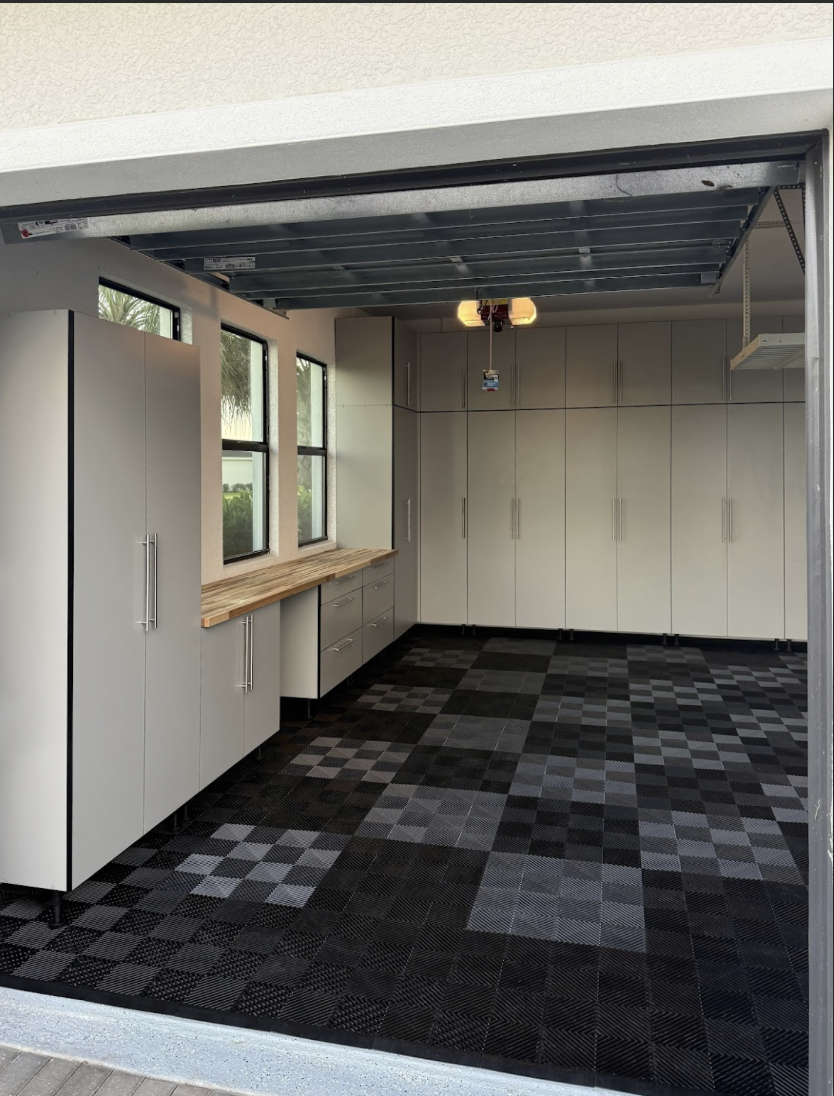 To bring the vision together, the space was outfitted with fog gray garage cabinetry for clean, closed-door storage along with an overhead storage rack to maximize ceiling space for larger items and totes. A dedicated workstation area gives the homeowner a durable space for hands-on projects, while the garage floor was upgraded with RaceDeck flooring, providing a high-impact surface strong enough for weightlifting and heavy use. The finished result is a versatile Sarasota garage that combines organization, durability, and style.