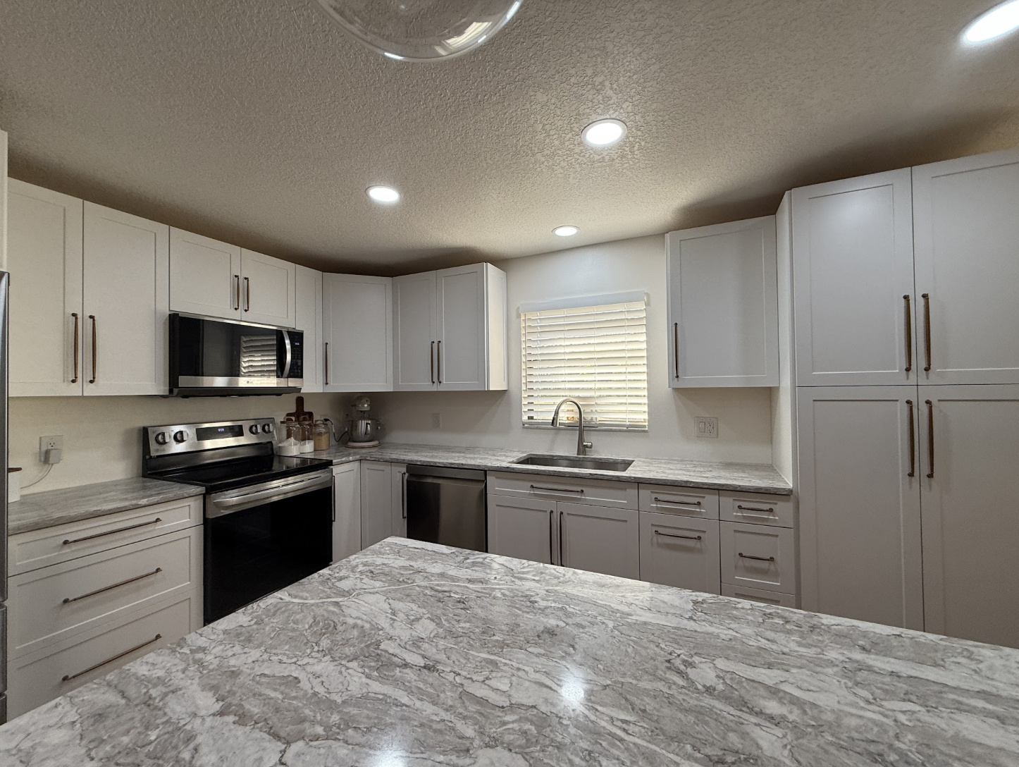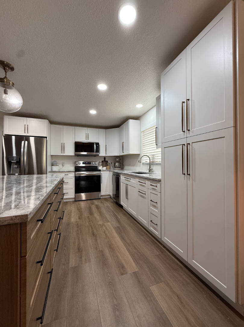 The new design features a beautiful two-toned cabinet layout with white shaker cabinets along the perimeter and custom wood grain brown shaker cabinets on the island, adding warmth and contrast to the space. Elegant Taj Mahal quartz countertops tie everything together while providing a durable, high-end finish. The kitchen was completed with antique bronze and black contrasting handles, a stainless steel appliance package, and a stainless steel undermount sink for a sleek, modern look.