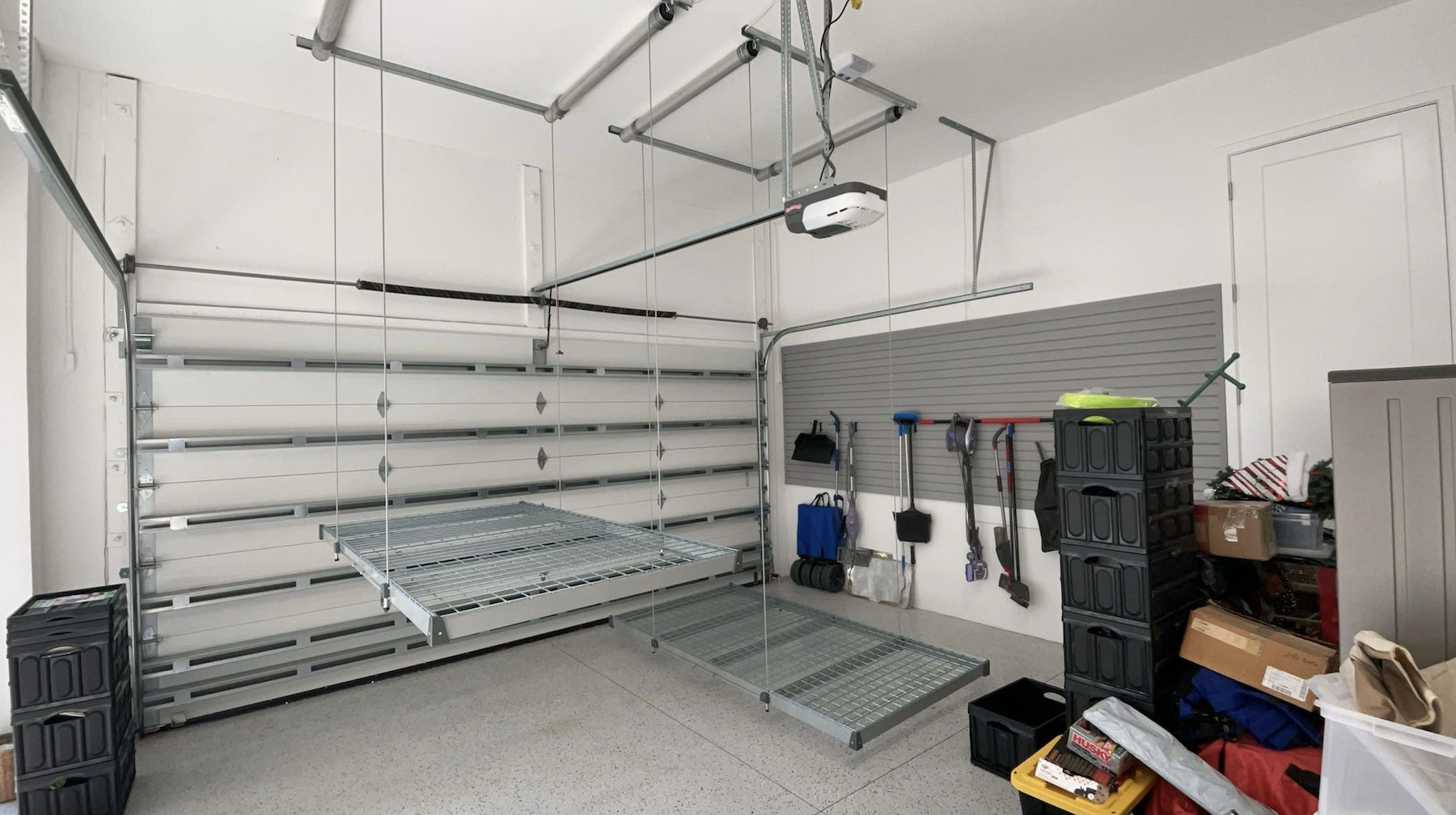 See how our Sarasota, FL team maximized garage storage with motorized overhead racks, custom cabinets, slatwall, and bike storage for a sleek, functional finish.