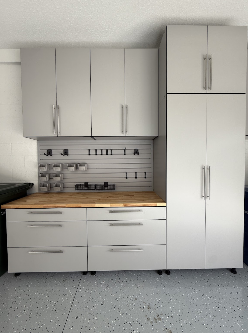Eric’s garage in Anna Maria Island got the perfect workspace with custom storage, fog gray cabinets, and butcherblock countertops. Take a look and call us today!